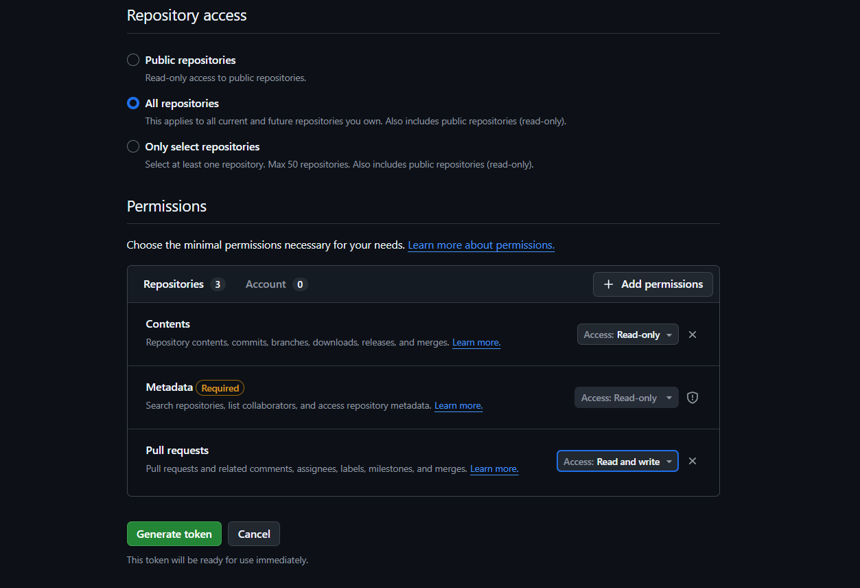 6. Select Repo permissions as below for Contents and Metadata (read), and Pull requests (read and write)