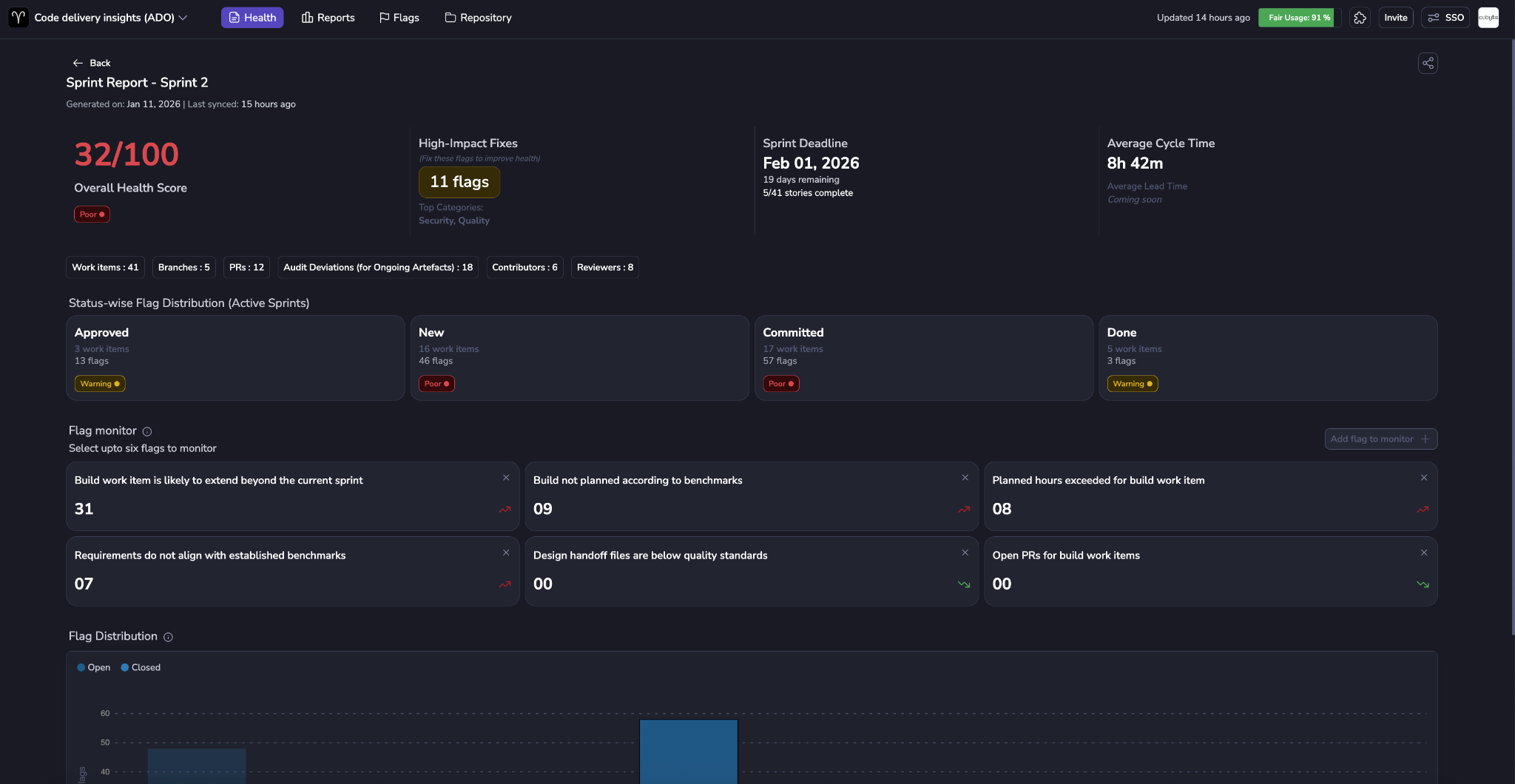 Sprint Health governance operates continuously throughout the sprint. It monitors policy-driven flags related to: